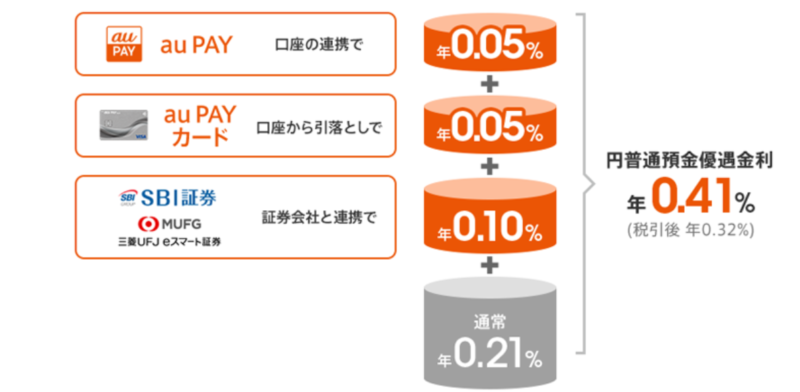 ちなみに、auじぶん銀行、三菱UFJ eスマート証券、au PAYカードの3つを揃えておくと、本記事で紹介するポイ活が可能になるだけでなく、auじぶん銀行の金利が年0.41%まで上がります!