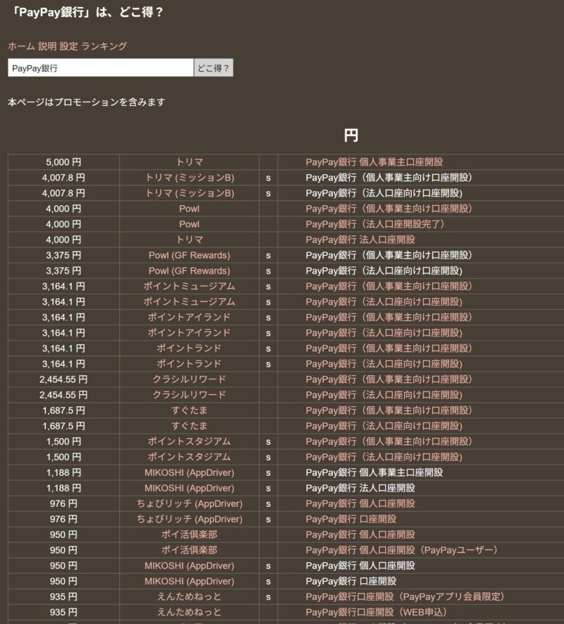 どこ得」というサイトで「PayPay銀行」と検索し、最もお得なポイントサイトから発行手続きを行いましょう!