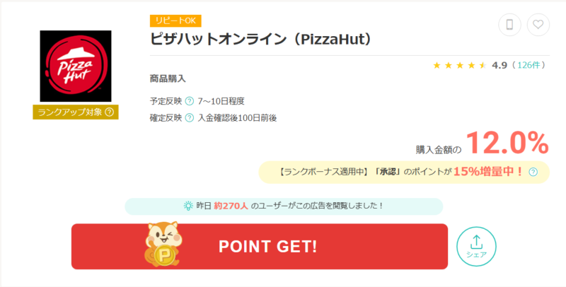 👆手順3の参考画像:モッピーのピザハット案件ページ(2025/10/22時点)