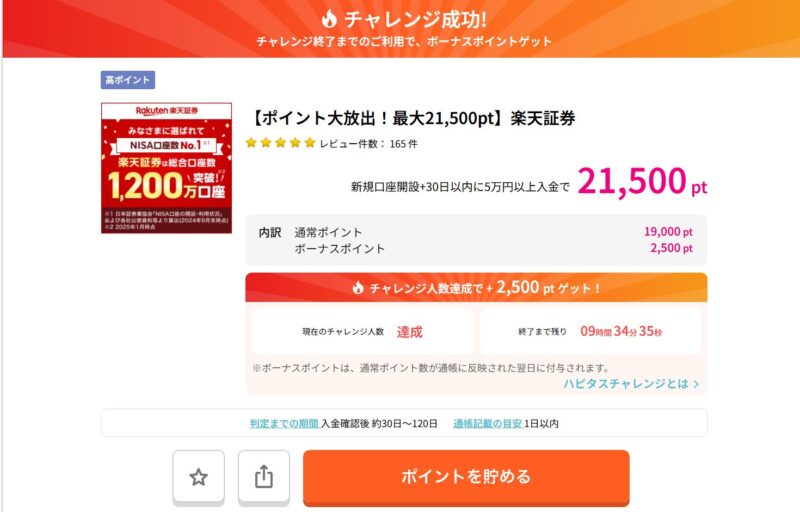 👆手順3の参考画像:ハピタスの楽天証券案件ページ(2025/10/22時点)