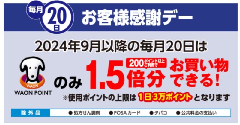 毎月20日の対象店舗でのお買い物の際、WAON POINTを利用すると、ポイントの価値を50%増量して利用することができます。